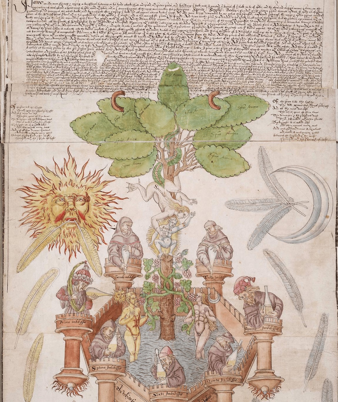 De nuevo le pregunté: Señor, ¿se puede extraer esta agua de algún otro modo? Y, ¿se la encuentra en todas partes? Me respondió: Está en todas partes, y nadie puede vivir sin ella; se extrae por medios admirables. Pero la mejor es la que se extrae por la fuerza de nuestro acero, el cual se encuentra en el vientre de Aries. Y le dije ¿para qué sirve? Respondió: antes de su debida cocción es un poderoso veneno, pero después de una cocción conveniente es una soberana medicina: y entonces da veintinueve granos de sangre, y a su vez, cada grano te proporcionará ochocientos sesenta y cuatro del fruto del árbol solar. Y le pregunté: ¿y no puede mejorar más allá? Según el testimonio de la escritura filosófica (dijo él), en primer lugar, puede ser exaltado hasta diez, después hasta cien, luego hasta mil, diez mil, y así sucesivamente. Insistí: Señor, dime si muchos conocen esta agua y si tiene un nombre propio. Profirió en voz alta: poca gente la ha conocido, pero todos la han visto, la ven y la quieren; no solamente tiene un nombre sino muchos y diversos. Pero su verdadero nombre es el agua de nuestro mar, el agua de vida que no moja las manos. Le pregunté todavía: ¿los que no son filósofos la usan para otras cosas? Cada criatura (dijo) la usa, pero de modo invisible. ¿Dentro de esta agua nace alguna cosa?, le dije. Con ella se hace todo lo que está en el mundo, y todo vive de ella, me dijo; pero propiamente nada hay en ella, sino que es una cosa que se mezcla con todas las cosas del mundo. Le pregunté: ¿Sin el fruto de este árbol, es útil? Me dijo: sin el fruto no es útil en esta obra, ya que sólo se mejora con el fruto del árbol solar.