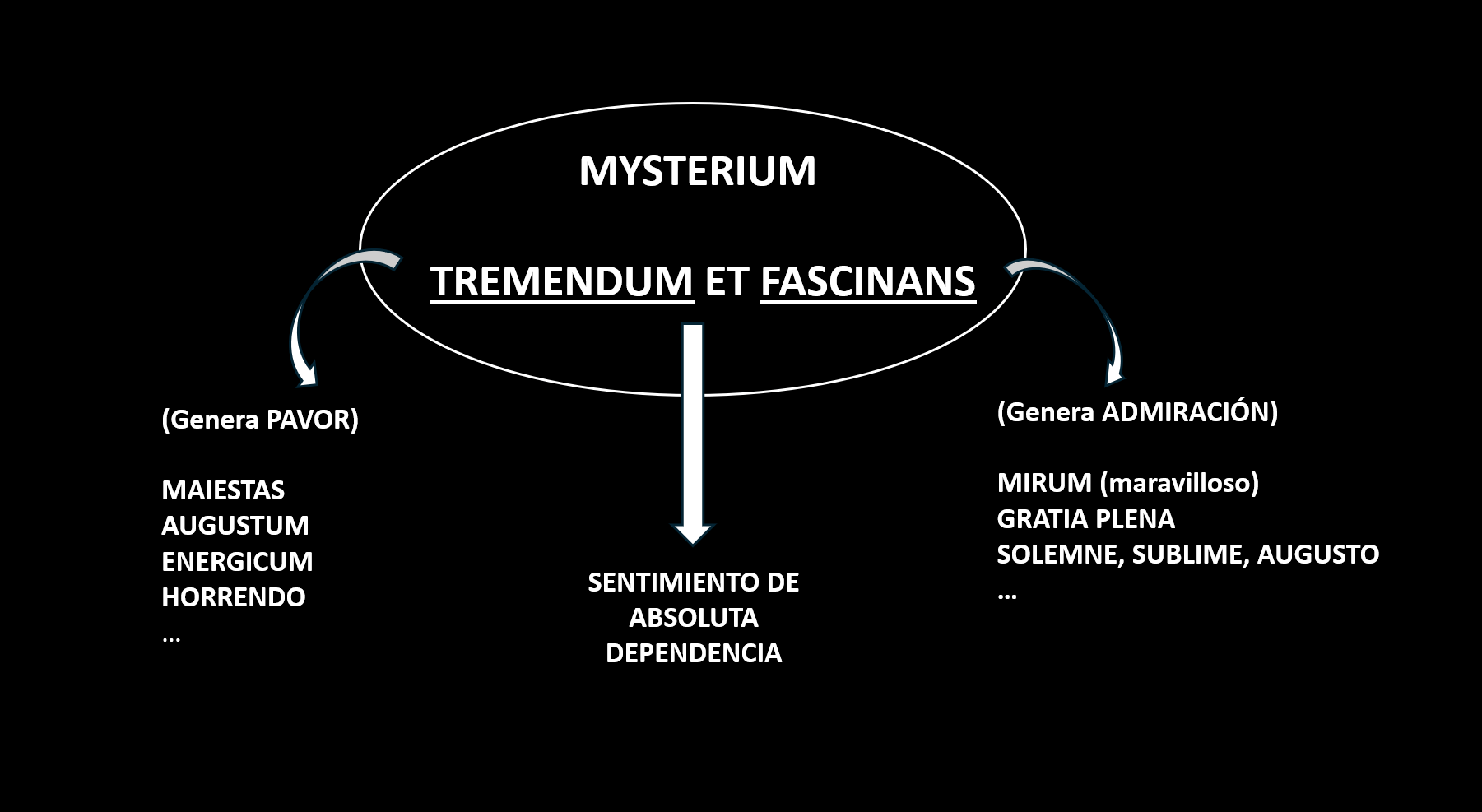 La expresión que lo compendia es mysterium tremendum, desde los grados más elementales y toscos hasta estadios más puros y transfigurados. Para definirlo se ha de proceder de manera puramente negativa, ya que misterio significa “lo que está oculto y secreto”, “lo que no es público”, lo que no se puede decir.