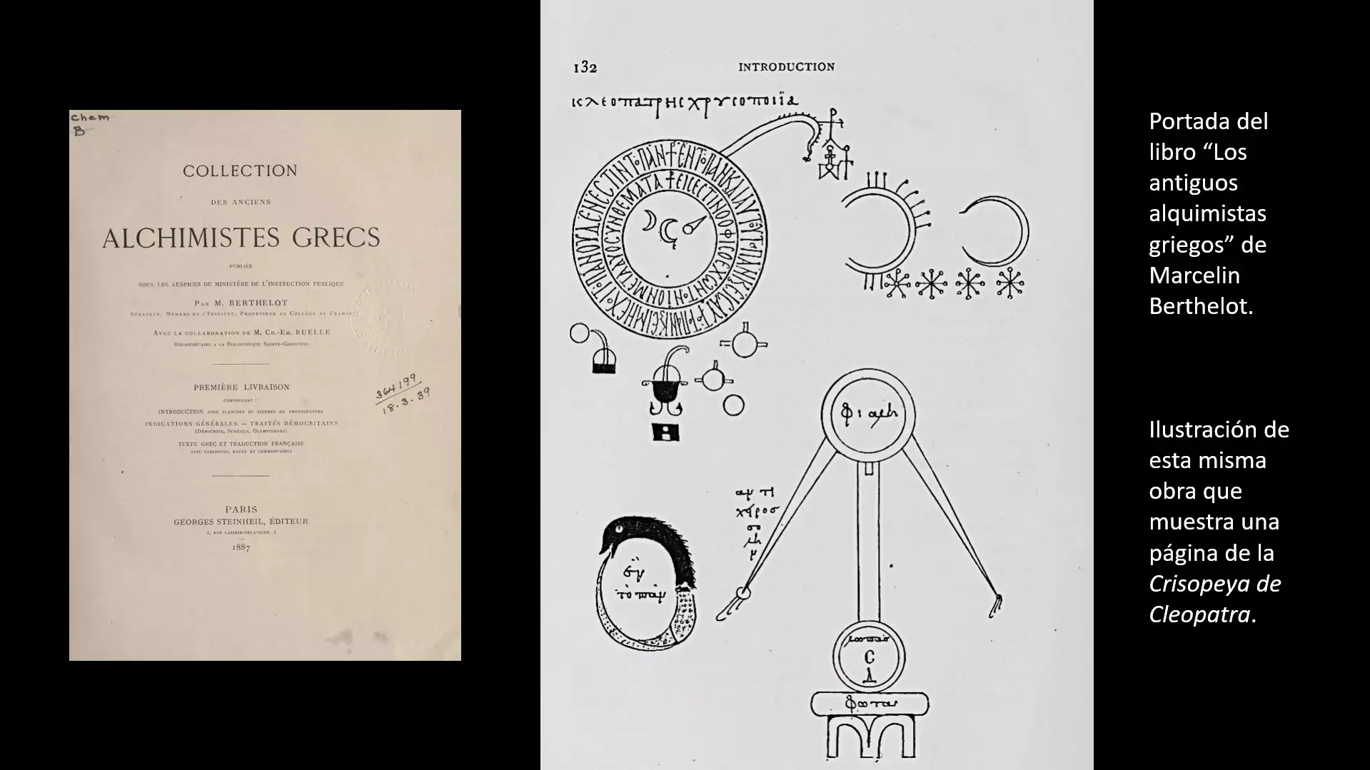 La alquimia se practicaba en Egipto mucho antes de que se encontraran en Tebas los primeros papiros del s. I escritos en griego. Muchos de estos papiros fueron recogidos en manuscrito que se conserva en San Marcos de Venecia y en el s. XIX fueron traducidos al francés por Marcelin Berthelot bajo el título La colección de los antiguos alquimistas griegos. Este fue el primer intento de investigar en la historia de la química y en consecuencia de la alquimia.