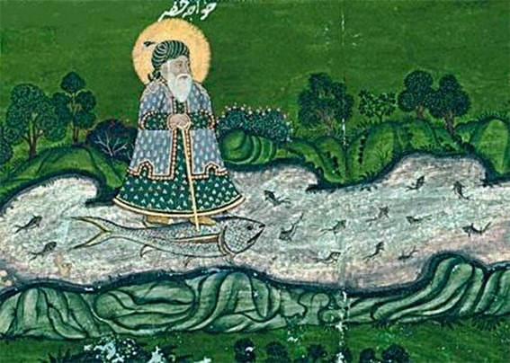 Se le representa siempre con un manto de color verde, su propio nombre significa «el que verdea», y una leyenda cuenta que con su sola presencia hizo reverdecer, es decir, devolver la vida, un desierto. Al khadir “el hombre verde”, el patrón de los viajeros que encarna la providencia divina. Un día, encontró una fuente en el desierto mientras caminaba con un pescado seco, hundió en el agua este pescado y revivió, Al-Khadir comprendió entonces que había alcanzado la fuente de la vida, se bañó en ella y se volvió inmortal mientras su manto se coloreaba de verde.